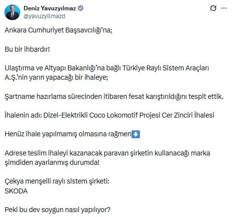 İhalenin yarın yapılacağını ve usulsüzlükleri tespit ettiklerini ifade eden CHP’li Yavuzyılmaz “Bu bir ihbardır” diyerek Ankara Cumhuriyet Başsavcılığı’na seslendiği paylaşımda şu ifadeleri kullandı: