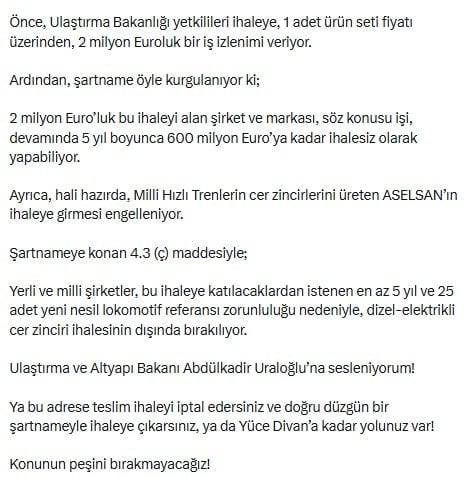 Ayrıca, hali hazırda, Milli Hızlı Trenlerin cer zincirlerini üreten ASELSAN’ın ihaleye girmesi engelleniyor.