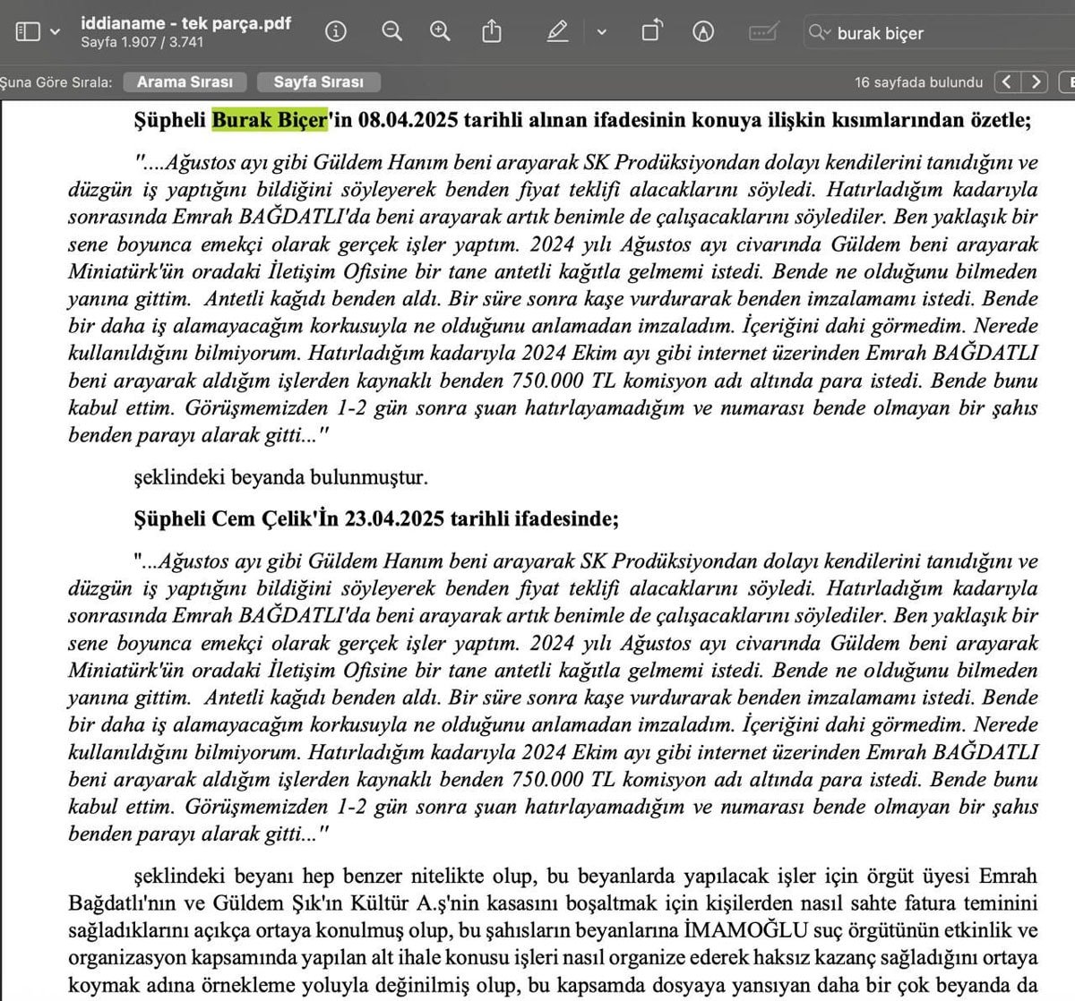 İBB’ye yönelik operasyonlar kapsamında 10 Temmuz tarihinde tutuklanan ve iddianamede “şüpheli” olarak geçen mali müşavir Cem Çelik ile yine iddianamede “şüpheli” sıfatıyla yer alan ve etkinlik sektöründe faaliyet gösterdiği belirtilen Burak Biçer’in birebir aynı ifadeleri vermeleri dikkat çekti. Biçer’in söz konusu ifadeyi 8 Nisan’da verdiği belirtilirken Çelik’in ise aynı ifadeyi 23 Nisan’da verdiği iddianamede yer aldı.